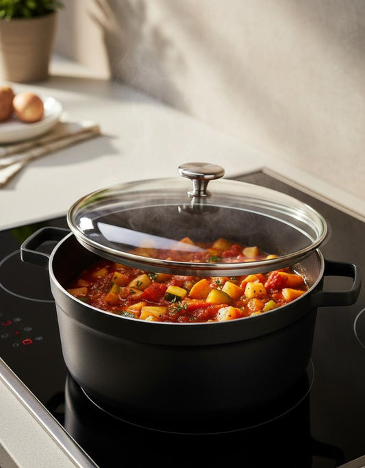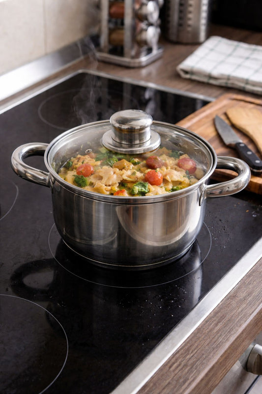 Cratita din inox, GermagTrend, compatibila cu plita cu inductie, cu capac din sticla termorezistenta, 24 cm, 21589