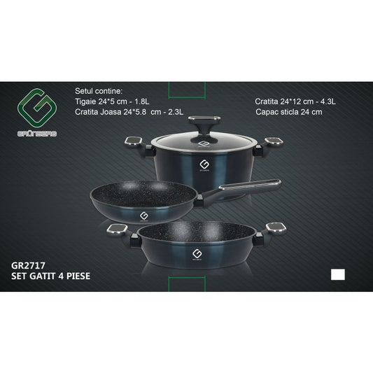 Set 4 piese: 3 vase din aluminiu, compatibile cu plita cu inductie, 1 capac din sticla termorezistenta, Grunberg GR2717 (rosu, verde, albastru)